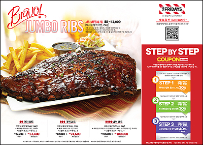 한편 TGI프라이데이스는 신제품 출시를 기념해 다음달 31일까지 사용할수록 혜택이 증가하는 ‘스텝바이스텝(STEP BY STEP)’ 쿠폰 이벤트를 진행한다. 홈페이지에 영수증 번호를 입력하면 다음 날 핸드폰으로 STEP 1 쿠폰을 전송하며, 해당 쿠폰 사용자에게 STEP 2, STEP 3 쿠폰을 순차적으로 발급한다. STEP 1쿠폰은 ‘브라보! 점보 립’30% 할인, STEP 2와 STEP 3 쿠폰은 각각 2인 세트메뉴를 30%, 40%씩 할인 받을 수 있다.