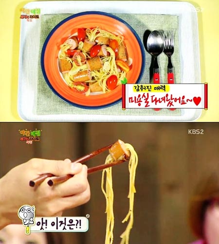 5일 오후 방송된 KBS 2TV ‘해피투게더3’ 세기의 라이벌 특집에 출연한 클라라는 야간매점 코너에서 스파게티에 소시지를 넣은 ‘미용실 다녀왔어요’라는 메뉴를 공개했다.