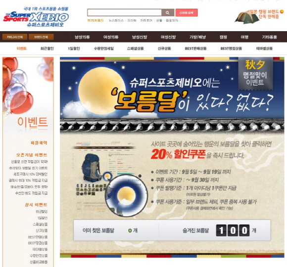 오는 19일까지 온라인쇼핑몰에서 진행하는 ‘슈퍼스포츠제비오에는 보름달이 있다? 없다?’ 이벤트는 사이트 곳곳에 숨겨진 보름달 모양의 아이콘을 먼저 찾아 클릭한 고객에게 20% 할인 쿠폰을 증정한다.