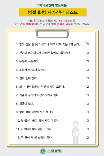 명절 화병이라고 불리는 이 증상은 특별히 외상에는 이상이 없기 때문에 무심코 지나가기가 쉽지만 방치하면 큰 병의 원인이 될 수 있어 자가 진단을 통해 자신의 상태의 경중도를 파악하는 것이 중요하다.