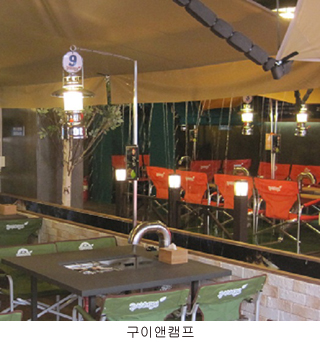 도심 속 캠프장 콘셉트의 고깃집 프랜차이즈 ‘구이앤캠프’는 굽기와 볶음요리가 가능한 실내형 화로테이블과 천막에서 자동으로 물이 떨어지게 설계된 타프레인시스템에 대해 특허를 출원, 다른 고깃집과 확실한 차별화로 호응을 얻고 있다.