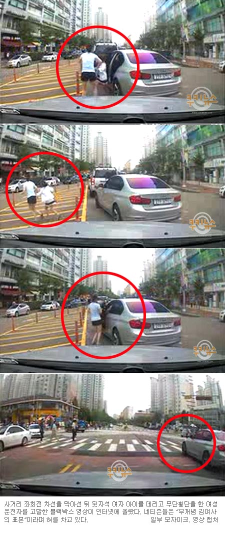 [쿠키 사회] 사거리 좌회전 차선을 막아선 뒤 뒷자석 여자 아이를 데리고 무단횡단을 한 여성 운전자를 고발한 블랙박스 영상이 인터넷에 올랐다. 네티즌들은 “무개념 김여사의 표본”이라며 혀를 차고 있다.
