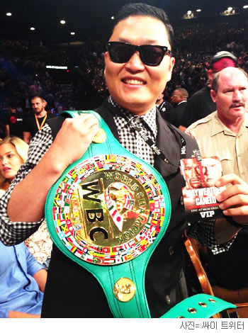 싸이는 WBC 웰터급 타이틀 매치가 열린 15일 미국 레스베이거스 MGM 그랜드호텔 특설 경기장에서 챔피언 벨트를 들고 촬영한 사진을 트위터(@psy_oppa)에 공개했다. 이 경기는 메이웨더 주니어가 사울 카넬로 알바레스(23·멕시코)를 상대로 벌인 타이틀 방어전이었다. 평소 할리우드 스타들이 대거 등장하는 메이웨더 주니어의 경기에서 싸이는 챔피언 벨트를 직접 들어올리며 세계적인 명성을 증명했다.