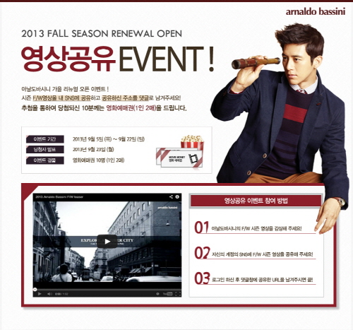 아날도바시니는 홈페이지 가을 리뉴얼 오픈을 기념하기 위해 영상공유 이벤트를 진행하고 있다. 이벤트에 참여하려면 남성 아날도바시니의 공식 홈페이지(www.abmen.co.kr)에 링크된 고수의 아날도바시니 2013 F/W 시즌 영상을 감상한 다음 영상을 자신의 SNS를 통해 공유하고 공유한 해당 URL을 이벤트 페이지에 댓글로 남기면 된다.
