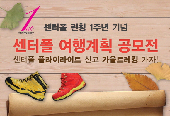 이번 이벤트는 센터폴 론칭 1주년을 기념해 고객 사은의 의미를 담아 9월 한 달 간 진행된다. 센터폴 홈페이지에 올 가을 국내외 트레킹 및 여행 계획을 작성해 응모하면 추첨을 통해 총 15명을 선발, ‘플라이 라이트’ 등산화를 선물로 제공하는 행사다. 최종 당첨자는 10월 7일 홈페이지 공지 및 개별 연락을 통해 고지된다.