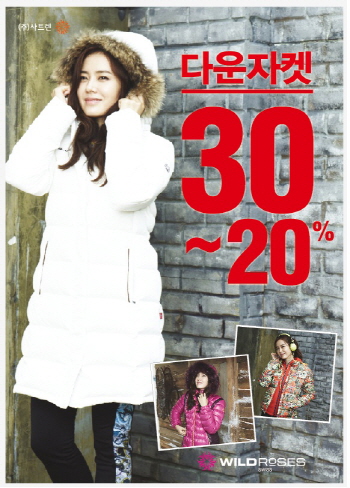 와일드로즈의 2013년 겨울 신상품 다운재킷을 제품에 따라 20~30% 할인된 가격으로 구매할 수 있다. 특히 새로 출시한 ‘손예진 다운자켓’ 겨울 시즌 주력 상품으로 뛰어난 기능성과 세련된 디자인에 실용성까지 고루 갖추고 있어 아웃도어 활동은 물론 일상생활에서도 멋스럽게 입고 다닐 수 있다.
