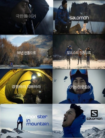 살로몬 아웃도어의 2013 F/W 시즌 TV CF는 영화 ‘반지의 제왕’ 촬영지로 유명한 뉴질랜드 퀸스타운에서 촬영했다. 경기장을 지배하는 스포츠선수처럼 산 위를 지배하겠다는 의미의 ‘몬스터 인 마운틴’을 슬로건으로 한 이번 광고는 멈추지 않는 도전과 거친 아웃도어의 모습을 담았다.