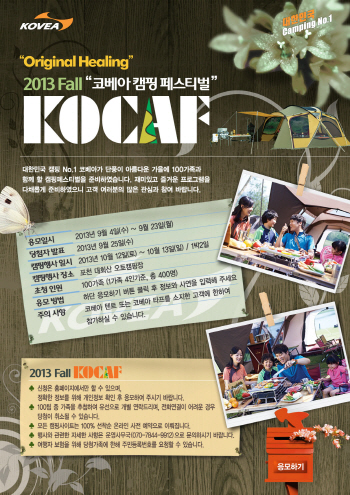 [쿠키 생활] 종합 캠핑용품 기업 코베아는 다음달 12일부터 13일까지 포천 대회산 캠핑장에서 가을 맞이 ‘코베아 캠핑 페스티벌 코카프(KOCAF)’를 연다.