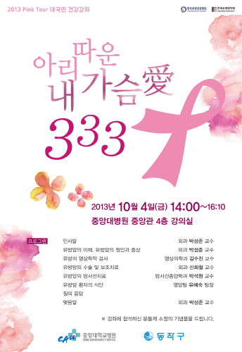 [쿠키 건강] 오는 10월은 유방암 예방의 달이다. 이에 중앙대학교병원(원장 김성덕)이 다음달 4일(월) 오후 2시부터 병원 중앙관 4층 강의실에서 ‘아리따운 내 가슴 愛’란 주제로 <유방암 건강강좌>를 개최한다.