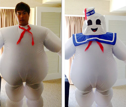 류현진은 27일 오후 2시50분 트위터에 “오늘은 정장 안 입고…‘라는 짧은 글을 적고 영화 고스트버스터즈에 등장한 마시멜로맨 복장을 입은 자신의 사진을 공개했다. 류현진의 변장은 신인 선수가 독특한 복장이나 분장으로 대중 앞에 서는 루키헤이징을 위한 것이다.