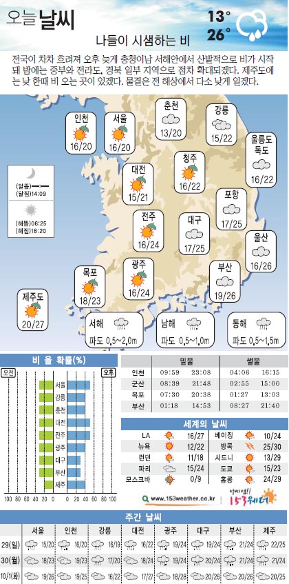 [쿠키 사회] 9월의 마지막 주말인 28일에는 전국이 기압골의 영향으로 차차 흐려져 오후 늦게 충청 이남 지방부터 비(강수확률 60∼80%)가 내리겠다. 아침 저녁으로 쌀쌀했던 전날과 달리 기온이 올라 그리 춥지는 않겠다.