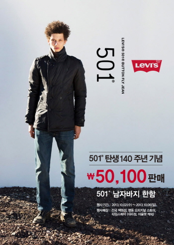 [쿠키 생활] 리바이스는 브랜드의 아이콘인 501 청바지 탄생 140주년을 기념해 오는 2일부터 6일까지 남성 제품에 한해 501 청바지를 50100원에 판매한다고 밝혔다.