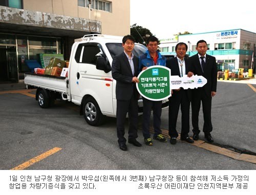 [쿠키 사회] 초록우산 어린이재단 인천지역본부(본부장 임신혁)와 현대자동차그룹(인천지점장 장순욱)은 1일 오전 인천시 남구청 앞에서 2000여만 원 상당의 포터차량을 창업을 준비하는 저소득 가정에 전달했다.