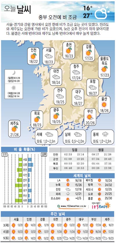 충청도는 대체로 흐리다 낮 한때 산발적으로 빗방울이 떨어지는 곳이 있겠다. 전라도와 경상남도, 제주도에서는 새벽에서 낮 사이 가끔 비(강수확률 60∼80%)가 오는 곳이 있겠다.