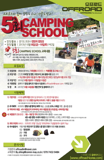[쿠키 생활] 팰주식회사에서 전개하는 오프로드는 오는 2일부터 13일까지 오프로드와 함께 하는 ‘제5회 캠핑스쿨’ 참가자를 모집한다.