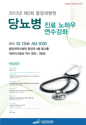 [쿠키 건강] 중앙대학교병원은 오는 10월 13일 오전 9시부터 병원 중앙관 4층 동교홀에서 ‘제2회 중앙대병원 당뇨병 진료 노하우 연수강좌’를 개최한다.