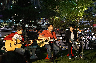 [쿠키 생활] 매주 금요일 밤, 가로수길을 흥겨운 음악의 거리로 물들이는 스쿨푸드의 베란다공연이 지난주 금요일에는 점심, 저녁 하루 2회 공연으로 가로수길을 찾은 고객들의 발길을 붙잡았다.