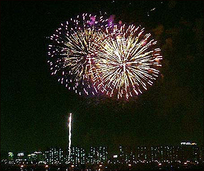 ◇불꽃놀이 사진 제대로 찍으려면…= 예쁜 불꽃을 제대로 표현하기 위해서는 반드시 삼각대를 챙겨야 한다. 노출시간이 길기 때문이다. 불꽃 사진을 찍을 때 가장 흔히 하는 실수는 오직 불꽃만을 찍는 것이다. 불꽃만을 화면 가득히 채운 사진은 몇 장 보다 보면 싫증이 날 수 있다. 우리 머리 위에서 아름답게 터져 나오는 불꽃들과 함께 어울릴 수 있는 주변 환경을 염두에 두고 촬영을 하면 훨씬 아름다운 사진을 얻을 수 있다. 63빌딩이나 원효대교, 혹은 함께 구경 간 친구 등을 함께 찍는다면 살아 있는 불꽃 사진을 얻게 될 것이다.