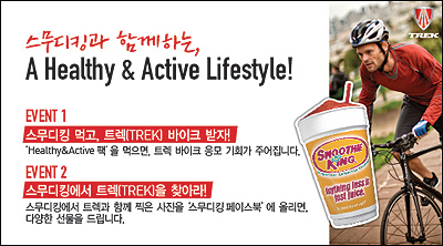 이번 이벤트는 스무디킹의 ‘A Healthy & Active Lifestyle’을 고객들과 함께 공감하기 위해 스무디킹의 브랜드 미션에 발맞춰 건강하고 활기찬 라이프스타일을 지향하고 있는 세계 No.1 자전거 브랜드 트렉(TREK)과의 제휴를 통해 진행된다.