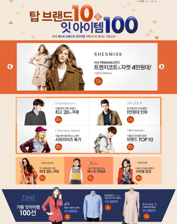 ‘탑 브랜드10&잇 아이템 100’으로 준비된 이번 기획전은 오는 14일 오전 9시까지 10대 베스트 브랜드와 잇 아이템 100선을 선보여 가을 패션 아이템과 기모 및 퍼 점퍼 등의 겨울 상품을 미리 구입할 수 있다.