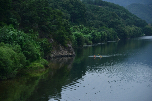 신선놀음에 도끼자루 썩는 줄 모른다고 했던가. 초록이 녹아 흐르는 싱그러운 여름 강의 막바지에서 투명한 강물에 비치는 적벽강의 풍경들이 고요하게 다가온다. 바람소리만 이따금씩 들려오는 수면 위에 떠있노라니 절로 콧노래가 흥얼거려진다. 수통대교에서 인삼골캠핑장으로 이어지는 구간은 수심이 깊지 않고 급류 코스가 적어 초보자가 타기엔 안성맞춤이다. 소나무숲과 인삼밭을 양쪽으로 끼고 있고 풍광이 수려해 쉬엄쉬엄 둘러보는 재미도 쏠쏠하다.
