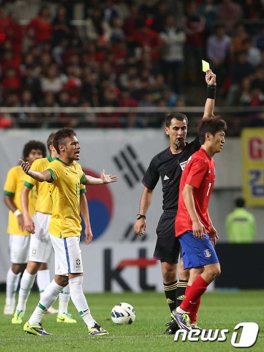 네이마르는 12일 서울월드컵경기장에서 열린 한국과의 친선경기를 2대 0 승리로 마친 뒤 “한국 선수들이 나에게 집중적으로 태클을 걸었다. 특히 등번호 7번과 16번 선수가 거칠었다”고 말했다. 등번호 7번인 이청용(25·볼튼 원더러스)과 16번인 기성용(24·선덜랜드)을 겨냥한 발언이었다. 그는 “이런 상황을 자주 겪지만 부상 때문에 조심스러울 수밖에 없었다”고 덧붙였다.