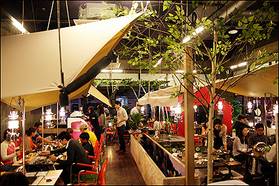 구이앤캠프 전북도청점은 132㎡ 규모의 비교적 아담한 매장으로 곳곳에 세워둔 나무들이 울창한 숲을 이뤄 캠핑장에 온 듯한 느낌을 극대화 했다.