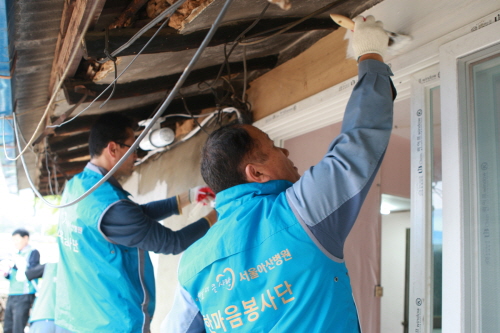 특히 이날 찾은 마을에서는 병원 시설팀 직원들의 주거환경 개선 봉사활동도 이어졌다. 시설팀 자원봉사자들은 열악한 주거환 속에서 지내는 기초생활수급자인 노부부 가정을 방문해 본격적으로 추위가 시작되는 겨울철을 대비한 욕실 수리, 내부 단열공사, 도배ㆍ장판, 페인트칠 등에 구슬땀을 흘렸다.