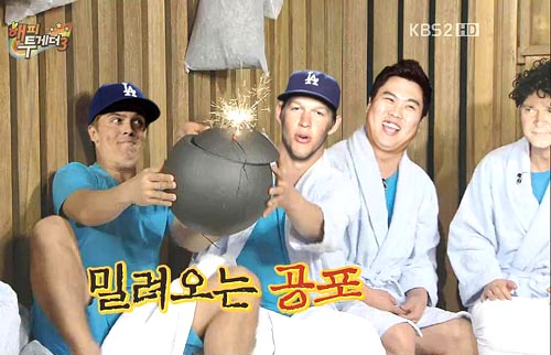 다저스 폭탄 돌리기라는 패러디 사진은 잭 그레인키가 세인트루이스 카디널스와의 챔피언십시리즈 5차전에서 승리한 직후 나돌았다. 사진에는 잭 그레인키가 ‘이크~ 이크~’하는 표정으로 폭탄을 6차전 선발투수인 커쇼에게 넘기는 모습이 담겨있다. 커쇼는 다소 부담스러운 얼굴로 폭탄을 받아들고 있다. 7차전에 나서는 류현진은 커쇼 옆에서 특유의 황망한 웃음을 짓고 있다. 류현진 옆에는 매팅리 감독이 초조하게 폭탄을 돌리는 모습을 지켜보고 있다.