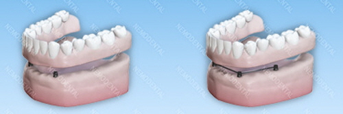 틀니 임플란트는 위아래 2~4개 정도, 총 4~8개 정도의 임플란트를 식립한 후 나머지는 틀니로 제작. 만들어진 틀니와 임플란트를 강력한 자석 등을 이용하여 고정력을 강화시킨다.
