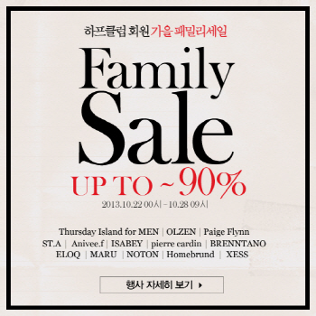 온라인 회원을 대상으로 진행하는 이 행사는 하프클럽 온라인 몰 내 입점된 국내 유명 브랜드 총 20여 개가 참여한다. 각 카테고리 별로 인기 브랜드를 선별하여 진행하는 이번 행사는 써스데이 아일랜드, 콕스, ST.A 등의 캐주얼 인기 브랜드와 올젠, 제스 등 인기 남성 브랜드가 참여한다. 여기에 이사베이, 아니베에프 등 인기 여성 커리어 브랜드가 대거 참여하여 80%에서 최대 90%까지 할인된 가격으로 한정 판매한다.