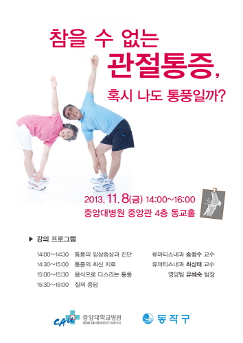 [쿠키 건강] 중앙대학교병원은 오는 11월 8일 오후 2시부터 병원 중앙관 4층 동교홀에서 ‘통풍 건강강좌’를 개최한다.
