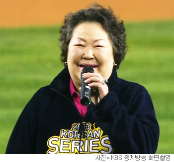 [쿠키 스포츠] 한국야구의 첫 번째 여성 장내아나운서인 모연희(73) 여사가 프로야구 한국시리즈 4차전에서 시구했다.