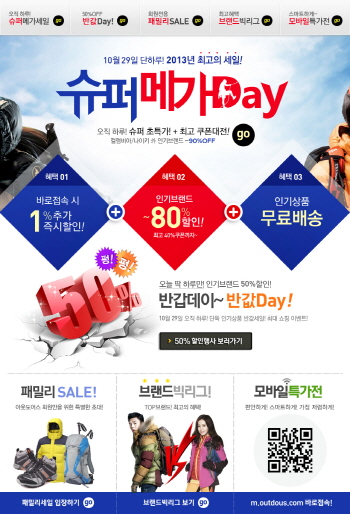 정가 29만원대의 캐스팅 니트 집업 점퍼를 90% 할인된 2만 5천원대에 판매하여 큰 인기를 끌고 있다. 아웃도어스에서 얼마 전 오픈한 모바일웹에서도 ‘슈퍼 메가 세일’ 이벤트가 진행된다.