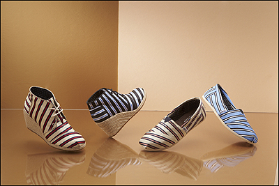 이번 컬렉션은 타비타 시몬스를 대표할 수 있는 스트라이프 패턴과 실키 한 소재가 탐스의 클래식과 데저트 웨지에 그대로 표현돼 여성의 우아함과 동시에 활기찬 분위기를 표현했다.