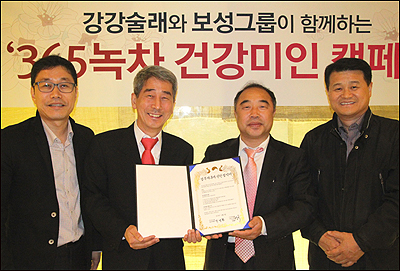 이날 협약식에서 김상국 강강술래 사장(사진 왼쪽 두번째)과 박명환 보성그룹 대표(오른쪽 두번째)는 강강술래 30만 멤버십회원 및 방문고객을 대상으로 녹차의 수도로 불리는 전남 보성 녹차의 우수성을 알리는 ‘365녹차 건강미인 캠페인’을 함께 전개하기로 했다.