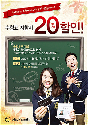 블랙스미스의 ‘수험생 할인 이벤트’는 1년 동안 고생한 수험생들이 평소 공부하느라 많은 시간을 함께 보내지 못했던 가족(또는 친구)들과 오랜만에 편안한 마음으로 블랙스미스에서 즐거운 시간을 즐길 수 있도록 마련된 가격할인 이벤트다. 수험생들은 계산 시 수험표를 제시하면 주문 금액에서 20% 할인을 받을 수 있다. 블랙스미스 청담점을 포함해 총 41개 매장에서 진행된다. 자세한 매장정보는 홈페이지(http://www.blacksmith.co.kr)를 통해 확인 가능하다.