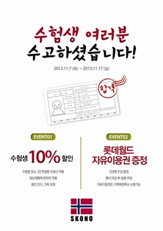 수능날인 7일부터 17일까지 열흘간 진행되는 스코노의 수능이벤트는 전 품목 10% 할인 기회와 구매고객 중 추첨을 통해 롯데월드 자유이용권을 증정하는 프로모션 등 두 가지로 실시된다.