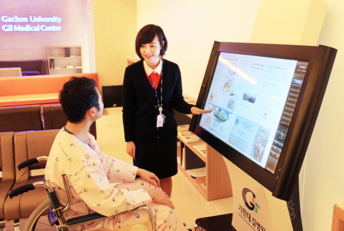 [쿠키 건강] 휠체어를 탄 환자나 장애인, 어린이들의 눈높이에 맞게 높이가 자동으로 조절되는 터치스크린 모니터가 병원에 설치됐다.
