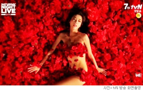 김규리는 9일 밤 11시 생방송된 케이블채널 tvN의 인기 코미디프로그램 ‘SNL 코리아’의 호스트로 출연했다. 김규리는 케빈 스페이시(53)와 아네트 베닝(55) 주연의 1999년 할리우드 영화 ‘아메리칸 뷰티’를 소재로 한 동명의 콩트에서 가장 많은 주목을 받았다. 금발의 10대 여성이 빨간 꽃잎을 깔고 누워 케빈 스페이시를 유혹하는 이 영화의 명장면을 김규리가 재현한 것이었다.