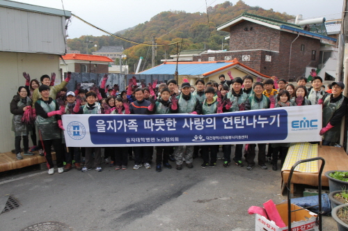 [쿠키 건강] 을지대학교병원 노사협의회는 9일 오전 8시부터 중구 대사동 일대에서 황인택 병원장 등 교직원 70여명이 참석한 가운데 ‘사랑의 연탄 나누기’ 행사를 펼쳤다.