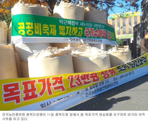[쿠키 사회] 충북 농민단체가 11일 쌀 가격 인상을 요구하는 야적 시위를 벌였다. 이들은 쌀 목표가격 23만원 보장과 기초농산물 국가수매제 실시를 요구했다.