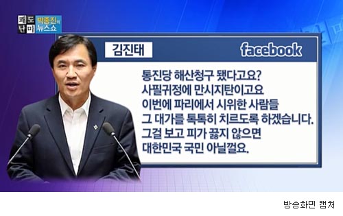 [쿠키 정치] 새누리당 김진태(49) 의원이 파리 시위대를 겨냥한 막말에 대한 사과를 거부했다. 그는 파리 시위를 통합진보당 등 좌파 시위꾼들이 주도한 것으로 규정한 뒤 시위대가 “통합진보당은 해산해야 한다”는 입장을 밝히면 자신도 사과할 용의가 있다고 말했다.