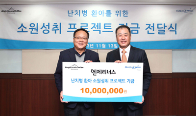 엔제리너스커피는 이번 기부를 위해 소셜커머스에서 커피 쿠폰 10만장 판매 이벤트를 진행했다. 기부금은 세계 최대 난치병 어린이 소원성취기관인 한국메이크어위시재단에 전달돼 난치병을 앓고 있는 어린이들의 소원을 이뤄주고 희망과 용기를 북돋아 주는 데 사용될 예정이다.