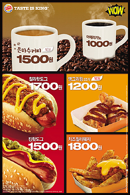 이번 겨울 ‘WOW 시리즈’를 통해 처음 출시되는 ‘은하수커피’는 복고풍의 옛 향수를 떠올리는 달콤한 커피로 기존 ‘아메리카노’와는 색다른 맛을 느낄 수 있다. ‘은하수커피’와 함께 첫 선을 보인 ‘앵그리윙’은 매콤한 핫페퍼 소스와 담백한 육질이 부드러운 닭 어깨살이 환상의 궁합을 자랑하며 출출한 시간 간단하게 즐기기 제격이다. 또한 고소한 참깨가 뿌려진 빵으로 업그레이드된 버거킹의 대표 간식 ‘킹핫도그’와 매콤한 칠리소스와 쇠고기 풍미가 매력적인 ‘칠리핫도그’도 만나볼 수 있다.