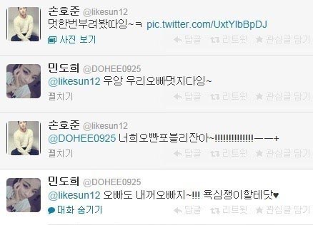 손호준은 재킷을 걸치고 바지 주머니에 양 손을 넣은 채 한껏 멋을 부리고 있다. 민도희는 손호준에게 “우와 우리 오빠 멋지다잉"이라는 답글을 남겼다. 두 사람 모두 드라마 속 캐릭터답게 전라도 사투리를 섞어 트위을 나눈 것이다.