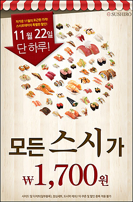 이번 11월 스시로데이에는 스시 한 접시당 무조건 1700원에 판매하며 세계 10대 슈퍼푸드 프로모션 메뉴를 포함한 100여 가지의 다양한 이색스시를 모두 균일가에 맛볼 수 있다. 스시로데이 균일가 프로모션은 종로, 신사, 목동, 발산, 인천, 연수, 울산 삼산, 창원 상남점까지 총 7개의 영업장에서 동시에 실시된다.
