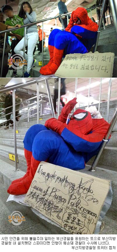 당시 스파이더맨 인형 곁에는 “부산에는 부산경찰이 있어 저는 할일을 잃었습니다”는 재치 있는 문구를 적은 종이판이 함께 있었다.
