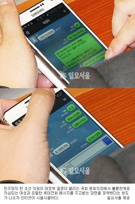 [쿠키 정치] 민주당의 한 초선 의원이 대정부 질문이 열리는 국회 본회의장에서 불륜관계로 의심되는 여성과 은밀한 휴대전화 메시지를 주고받는 장면을 포착했다는 보도가 나오자 인터넷이 시끌시끌하다. 네티즌들은 혀를 차고 있다.
