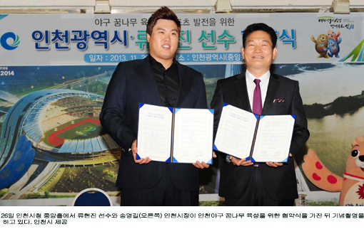 이날 협약식은 송영길 인천시장과 류 선수, 류 선수의 부모와 형 등이 참석한 가운데 개최됐다.